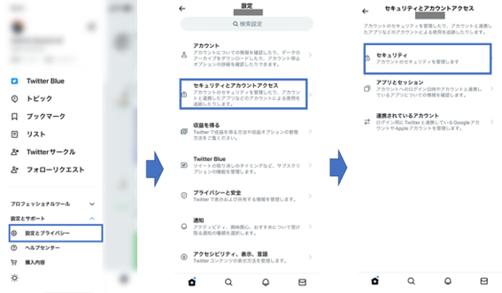 Twitterでは、アプリ画面内の左下の「設定とプライバシー」>「セキュリティとアカウントアクセス」>「セキュリティ」>「2要素認証」から、ショートメールや外部の認証用アプリを用いて、2要素認証の設定が可能です。※詳細な手順は以下の画像を参照ください。