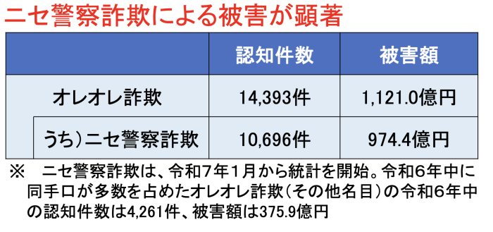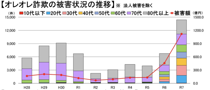 警察庁が発表したレポートによると、ニセ警察詐欺を含む「オレオレ詐欺」の令和7年の被害件数、被害額はともに前年に比べ顕著に増えています。
